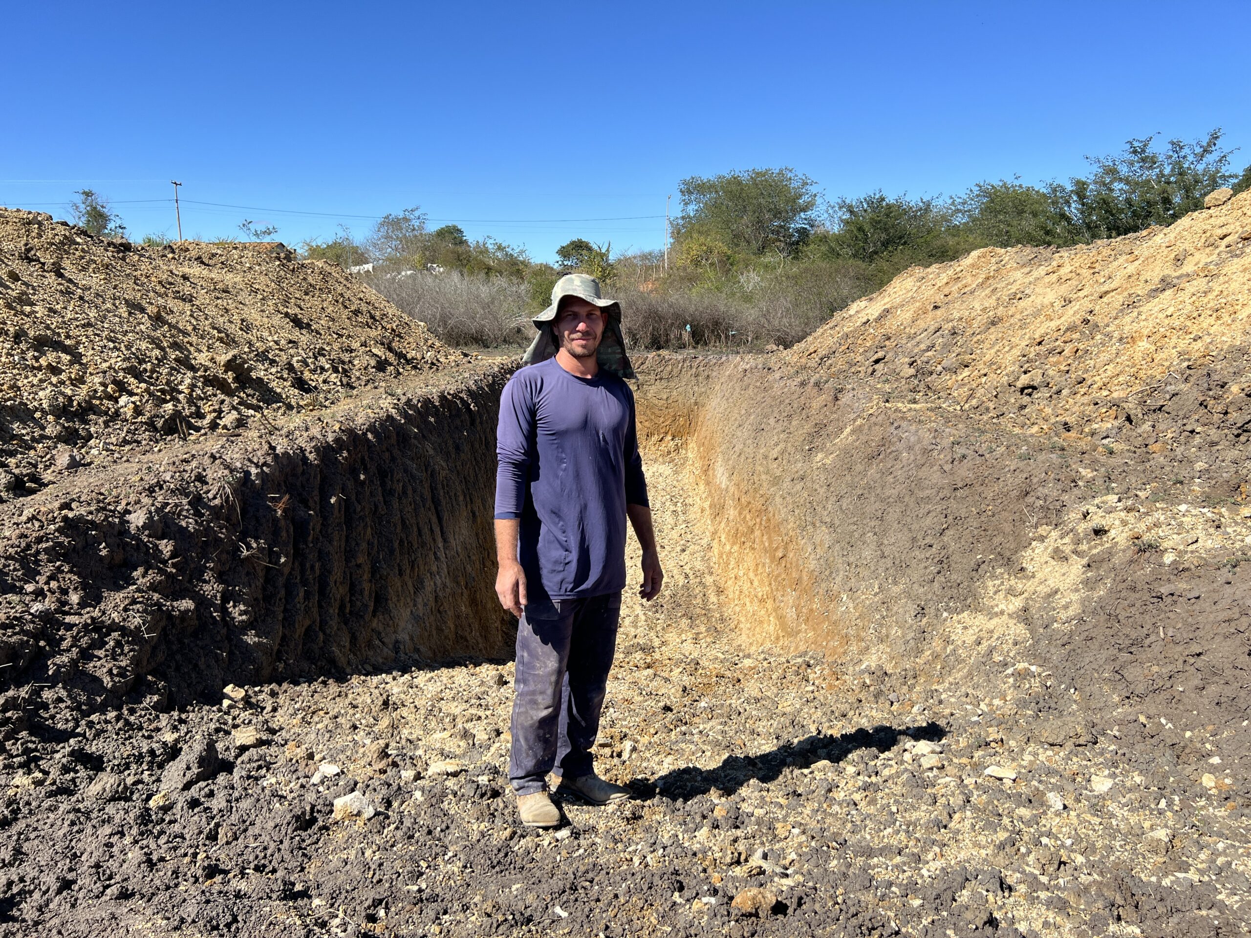 “O barreiro-trincheira com a capacidade de 500m³ sendo 6-7 metros de largura e 3m profundidade, reduzindo o espelho d’água. Pesquisas apontam que, aqui no semiárido, chove em média durante 2 a 3 meses, de 400 a 800 mm/ano. Com essa dimensão de 300 cm de altura, evapora em média 1m de altura da água. E realmente funciona esse cálculo. Na casa de meu pai tem um barreiro e, quando chega no final do ano, ainda tem água.”, contou Joabes Campos, animador técnico do Centro de Convivência e Desenvolvimento Agroecológico do Sudoeste da Bahia (CEDASB).
